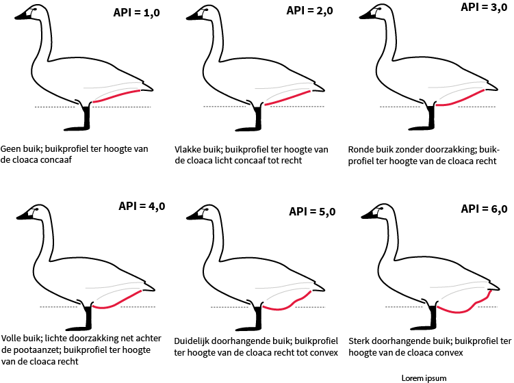 Op basis van Bowlers oorspronkelijke 6-puntsschaal, maar verder verfijnd om beter aan te sluiten bij de in het veld waargenomen buikprofielen, zijn er nieuwe herziene illustraties beschikbaar (gemaakt door G. Eichhorn en F. Mohrwinkel van de NABU, Duitsland). Deze herziene illustraties en beschrijvingen dienen als referentie voor het scoren van de zogenaamde Abdominal Profile Index (API). Daarnaast kunt u silhouetten downloaden waarop u zelf de lijn van het abdominale profiel kunt tekenen. Deze praktische oefening helpt u vertrouwd te raken met de profielverschillen en is ook nuttig voor het vastleggen van observaties in het veld.